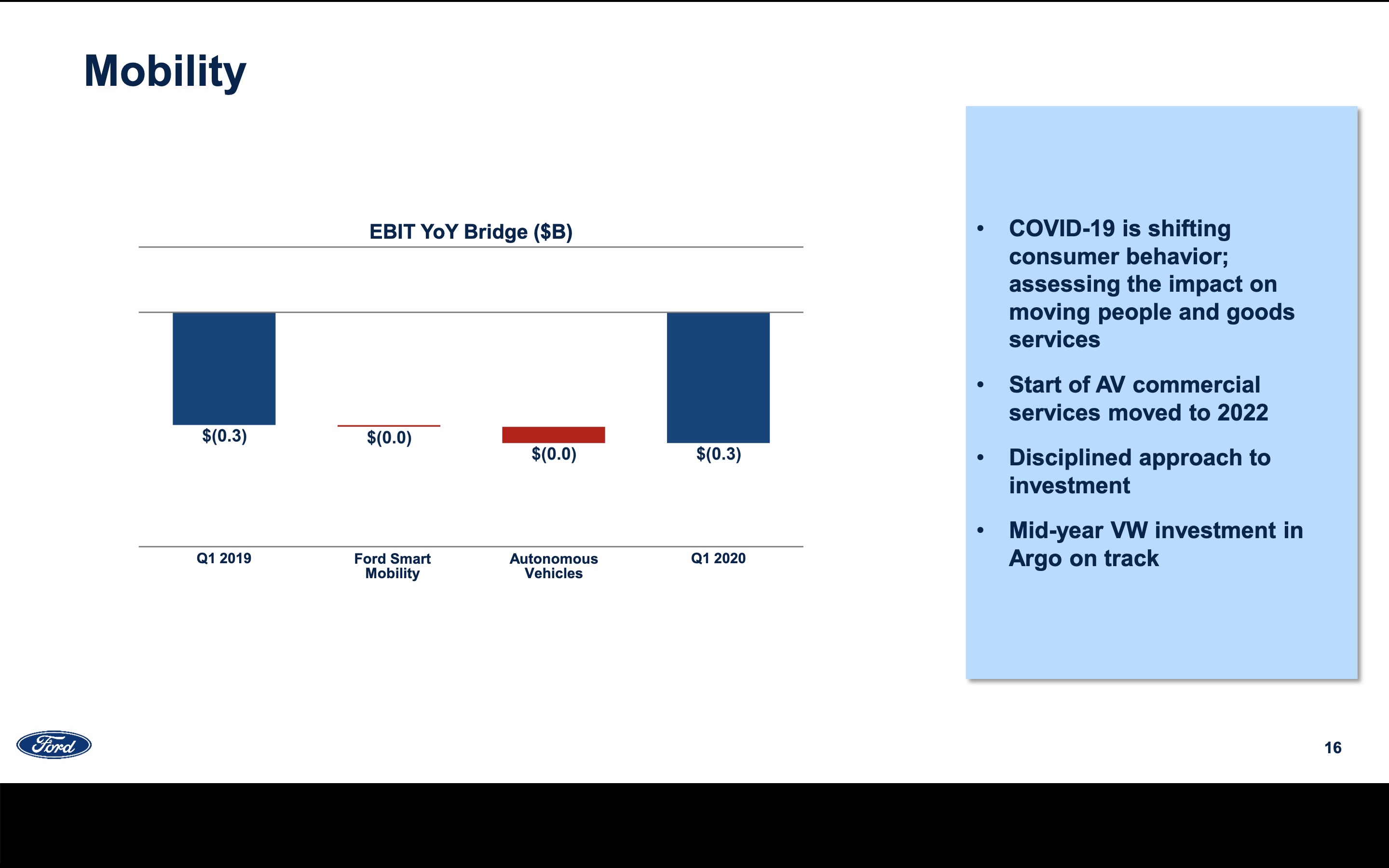 In a slide shared as part of the company’s quarterly earnings call, Ford reported that its “mid-year VW investment in Argo is on track.” VW Group announced in July 2019 it would invest $2.6 billion in capital and assets into Argo AI.