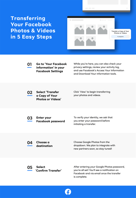 To use the feature, Facebook users will need to click on “Settings,” followed by “Your Facebook Information,” then “Transfer a Copy of Your Photos and Videos.” Facebook will ask you to verify your password to confirm your identity in order to proceed. On the next screen, you’ll be able to choose “Google Photos” as the destination from the “Choose Destination” drop-down box that appears. You’ll also need your Google account information to authenticate with its service before the transfer begins.