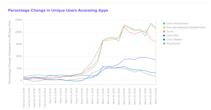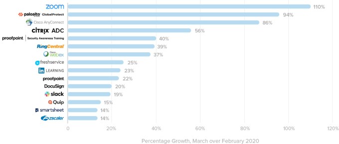The biggest winners here beyond collaboration tools were VPN businesses with Palo Alto Networks GlobalProtect and Cisco AnyConnect coming in at 94% and 86% usage increases respectively. But they weren’t the only tools growing, as Okta reported the Citrix ADC load balancing tool and ProofPoint’s security training apps also showed strong gains.