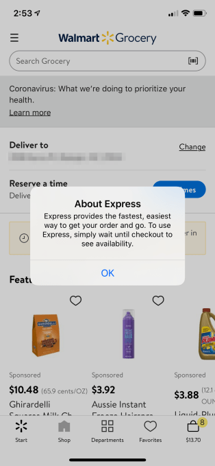 For items where the inventory is so limited it can’t guarantee delivery, it’s removing their availability from the online grocery service. Plus, the retailer says it’s not pushing back standard delivery orders to accommodate the high-paying Express customers. Instead, the Express service is being made available on top of Walmart’s existing grocery pickup and delivery capacity.