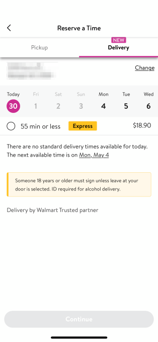 “In our tests, we were shown an Express fee of $18.90 to receive a delivery in 55 mins or less,” the app informed us today, April 30. There were no other fees. Without choosing the Express option, the next available time slot was not until next week, on Monday, May 4.