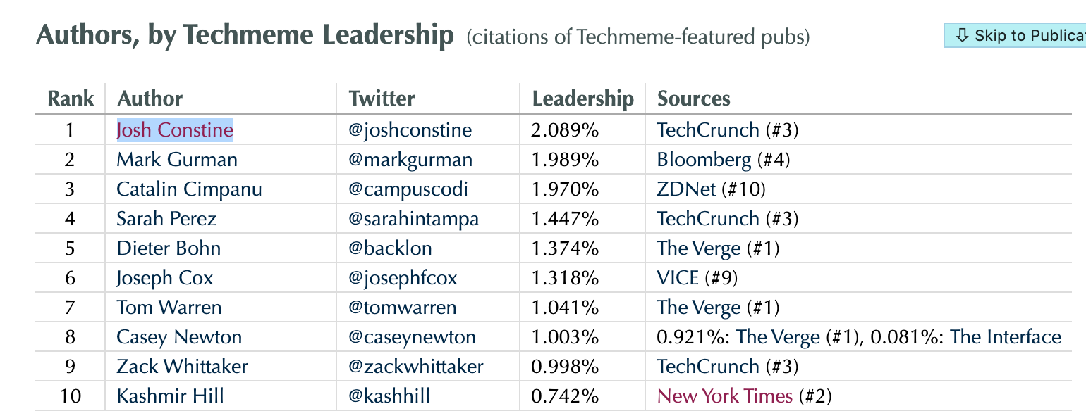 …Besides just reading this site, of course. Josh was the #1 ranked author on Techmeme, the news aggregator of record for the tech industry, by a number of measures. Want to find the right reporter to talk to, besides him? Go to Techmeme.com/lb to find expert TechCrunch authors and some of our most worthy competitors across 43 industry categories, including AI, e-commerce, enterprise software and many more. [Note: This is an unpaid plug for a great independent tech media product, we don’t normally run third-party shoutouts in here.]