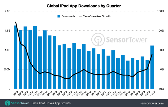 Sensor Tower reports that first-time downloads of iPad apps topped 1.1 billion worldwide in Q1 2020 — the largest number of new app installs since Q3 2016 (1.16 billion) and up 52% from Q4 2019. The surge could be attributed to increased iPad usage during the quarantine. App installs were led by games, entertainment and education.