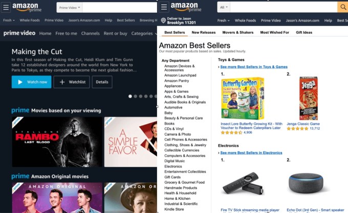 Visually distinct: The growth of design systems has largely been a boon, as designers could now make changes in a single place, changing the secondary font for instance, and having it deploy across the site or app. But this has also led to a feeling of sameness when browsing a large platform — and it makes it harder to experiment or make changes overall. Jackbox games all look and feel very distinct from each other. Fibbage 3 has a ’70s vibe to it, while Push the Button takes place in a spaceship. I want to see more companies do what Facebook and Foursquare did by actually splitting their product into standalone apps. Or you can at least make them more visually distinct like Amazon Prime Video’s darker theme over the bright shopping section.
