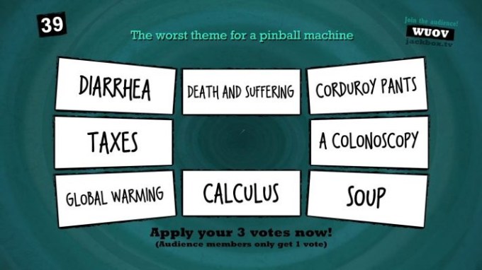 - Fibbage: A twist on the traditional trivia game, players are asked to invent an answer to a question of obscure knowledge (e.g. “a Swedish man who works as a dishwasher receives disability benefits due to his unusual addiction to ____.”) Then all the invented answers are mixed in with the truth and players must select the real answer while avoiding fakes. You earn points for guessing correctly and for tricking other players (the answer is “heavy metal”).
