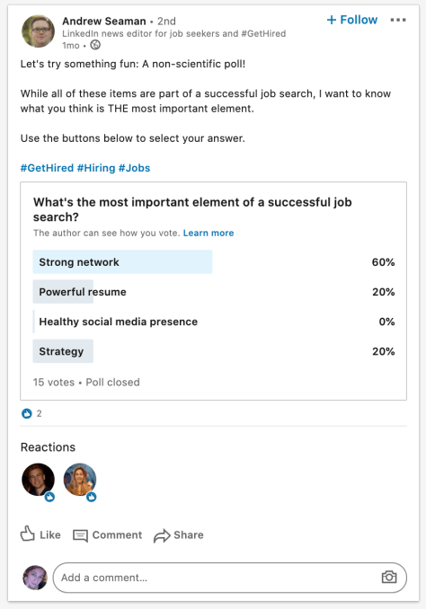 Two important distinctions with LinkedIn Polls as you can see above are that you are polling a very specific audience of people in your professional circle, and those people can both respond to the poll but also include comments and reactions. Both of these set the feature as it works on LinkedIn apart from the others and should give it some… engagement.