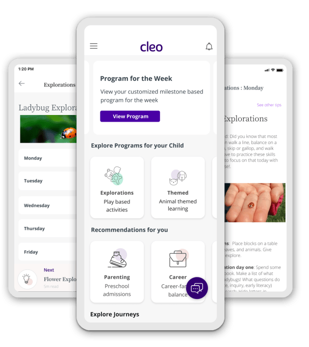 The program will additionally include access to other Cleo support programs, like one-on-one coaching and age-appropriate programs focused on developmental milestones, delivered weekly.