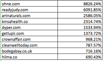 Here’s another sneak preview into an analysis we are doing with 1,000 D2C brands and their growth in traffic numbers. The top 10 D2C brands that grew the most in April 2020 over their peak traffic in 2019 are below. The growth rates are insane. I will share a more D2C-specific view once that analysis is done.