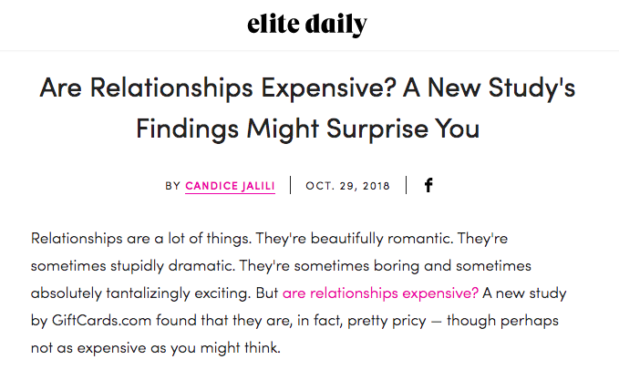 We created a project for one of our clients about the average cost of having a significant other. You may have heard people complain online about how much they spend on dates or questions about how much to spend on a spouse’s Christmas present. We surveyed people to get insight on how much all of these different aspects of a relationship cost, and because that was a new take on the topics, we earned coverage for our client in The Motley Fool, USA Today, Elite Daily and more.