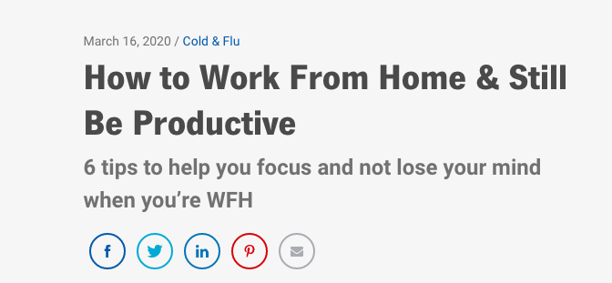Cleveland Clinic wrote such a piece about working from home. Note that you could read that headline and subheader at any time and it would still be relevant for people who work from home. But also note the date published: right around the time of the COVID-19 response in the United States. They address the timeliness in the beginning of the article, and in the future, that’s an easy edit to make it an evergreen piece.