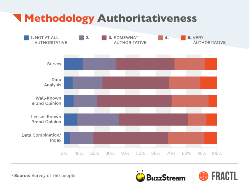 We looked into this further with BuzzStream and uncovered what we’d long suspected was true: methodology matters in terms of perceived authority. Anecdotal information, especially from a lesser-known brand, will just not resonate as much.
