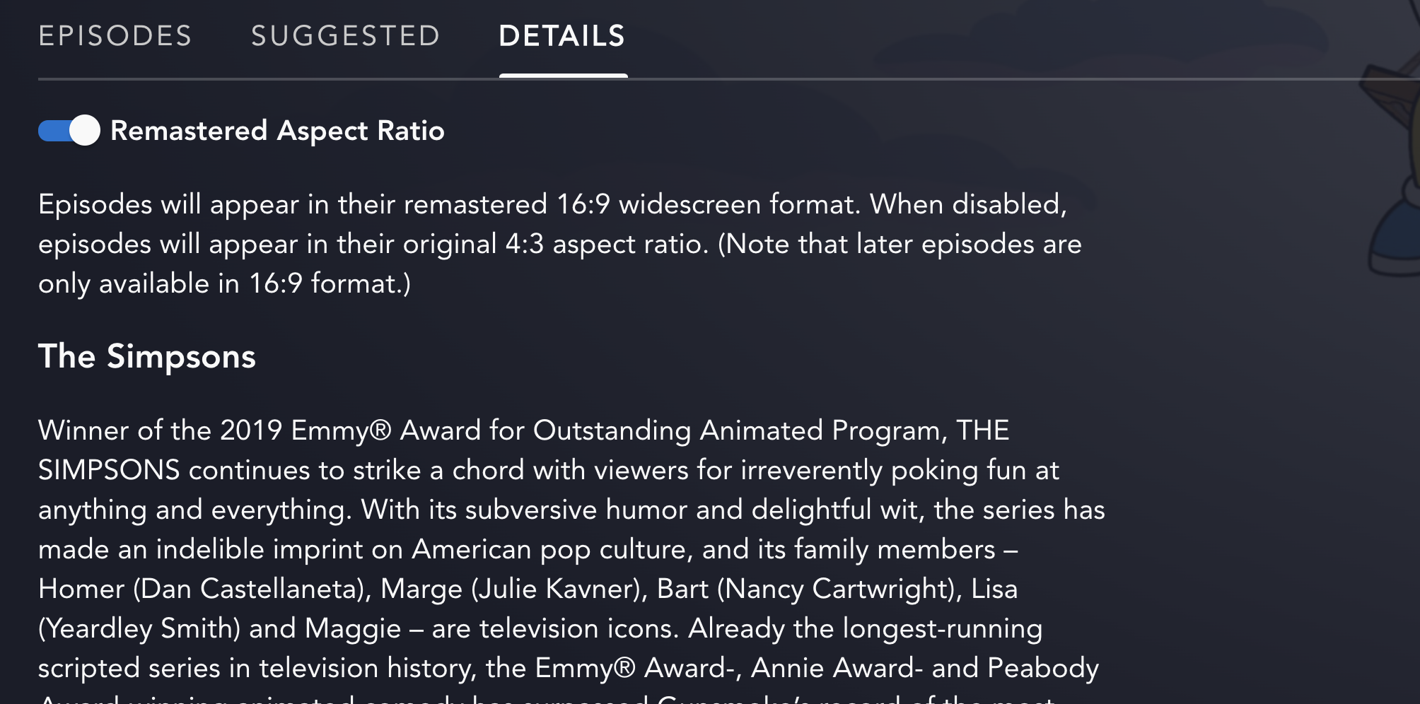 The long-promised fix is finally here. Turns out it was easier said than done. Episodes will still pop up in the remastered aspect ratio by default, but clicking into the show description and “Details” from the main menu will let you toggle that off. The move will return the shows to 4:3 up to Season 20, when the show began to be natively produced in 16:9.