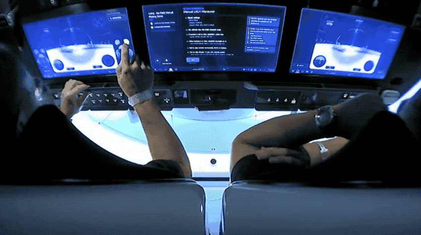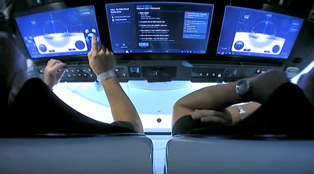 Astronaut Bob Behnken and Hurley removed their fashionable SpaceX space suits just before Hurley completed the manual maneuvers, which is also part of the plan. They’re able to go without the suits in the pressurized cabin during its transit to the ISS, only needing to put them back on for space station docking, and the interior of Crew Dragon actually provides them a fair amount of room to move around in. This also makes it easier for them to operate the spacecraft controls.