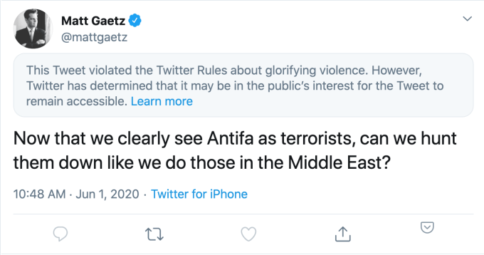 “We have placed a public interest notice on this Tweet from @mattgaetz,” a Twitter spokesperson told TechCrunch, linking its platform policy page. Twitter users can still share the tweet with comment, but regular retweets, likes and replies have been deactivated.