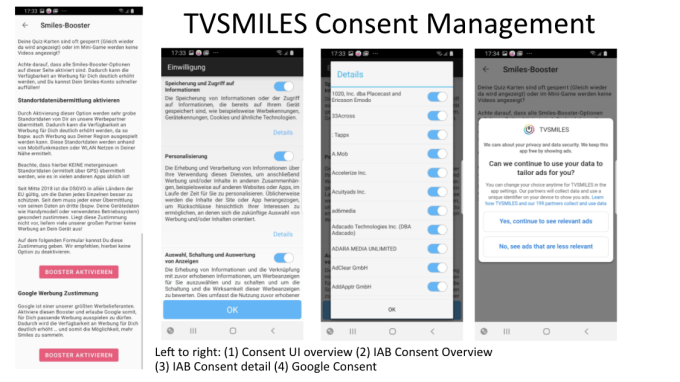 In its privacy policy, TVSmiles states that it only uses app users’ personal data “to the extent that this is legally permissible or you have given your consent… for the purposes of advertising, market research or the needs-based design of our offer” [text translated using Google Translate].