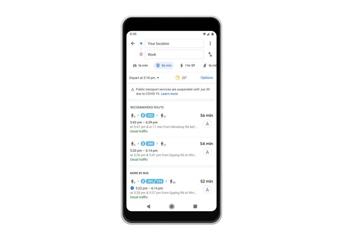 In several countries, Google says it will now display transit alerts from local agencies that will help users prepare for any government mandates that impact your ability to use public transit. For example, if services are closed or if you’re required to wear a mask, the alerts would include this information.