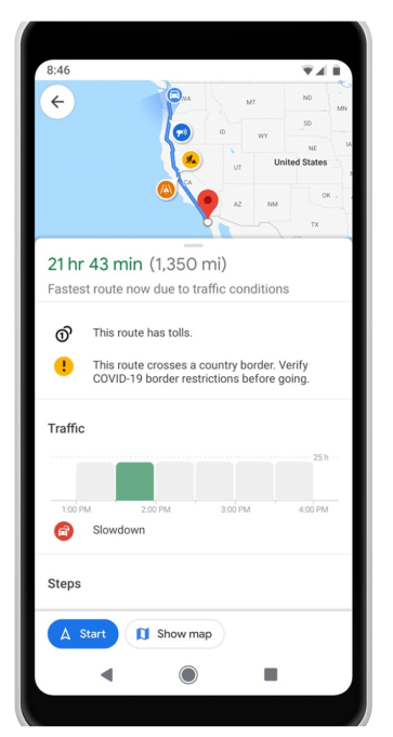 Google Maps will also now show if a trip’s navigation includes a COVID-19 checkpoint or restriction along your route, like when you’re crossing an international border. This is first launching with Canada, Mexico and the U.S., and will display an alert on the directions screen if your route is impacted. Google didn’t indicate any plans to expand this to more countries.