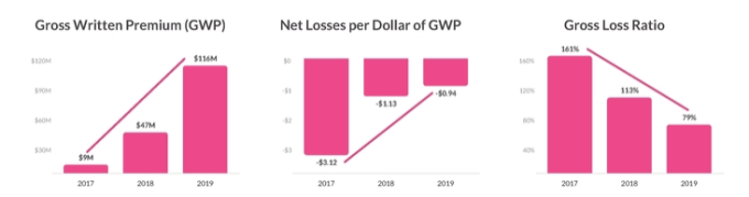 The second chart details how much money the company is losing on a net basis compared to the firm’s gross written premium result. This is a faff metric, and one that isn’t too encouraging; Lemonade’s GWP more than doubled from 2018 to 2019, but the firm’s net losses per dollar of GWP fell far less. This implies less-than-stellar operating leverage.
