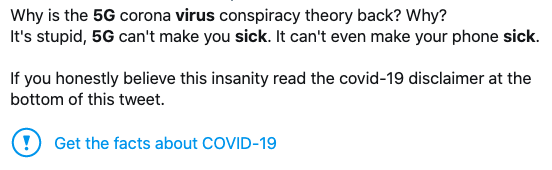 So strong, in fact, that Twitter began applying a label to some tweets about COVID-19 and 5G, encouraging users to “get the facts” about the virus. As Business Insider reported, clicking through the label leads to a page collecting sources debunking claims with links to pages like the BBC and Snopes. Earlier this year, the conspiracy was linked to a series of arson attacks on 5G towers.
