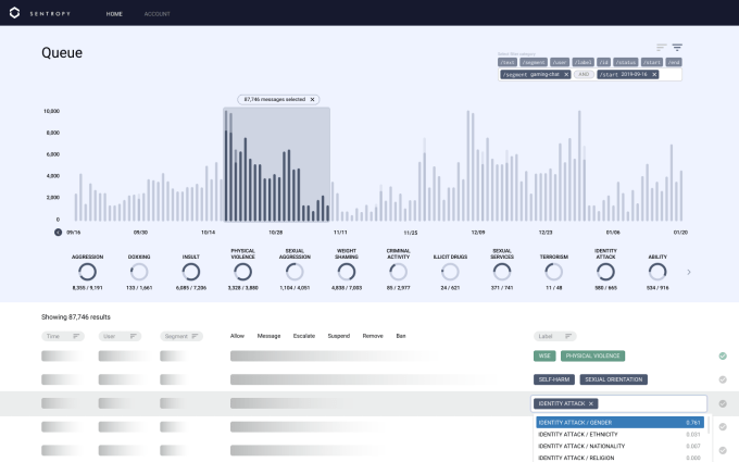 Sentropy is sold both as an API-based product for developers to implement and customise and as one that can be used out of the box to manage communities online, respectively branded Detect and Defend. Both implementations today are based on providing tools to humans to ultimately make moderation decisions for their respective platforms, although over time there could be a service added that will automate more of the work.