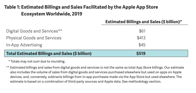 The new study examines the wider world of transactions on the App Store. While Apple earlier announced it has made $155 billion in direct payments to developers to date, the study attempts to position those payments as a “small fraction” of the total when sales from other sources — like physical goods and services — are also included.