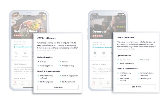 In a statement, Yelp’s head of consumer product Akhil Kuduvalli Ramesh said that the company’s response to the pandemic has broken down into two phases. During the first phase, “We helped businesses convey how they are updating their operating models and services they offered.”