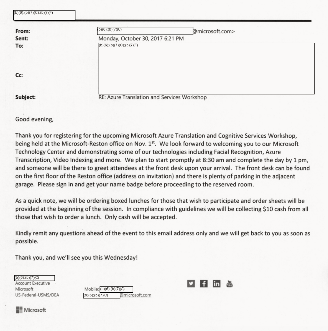 The emails, dated between September 2017 and December 2018, show that Microsoft privately hosted DEA agents at its Reston, Virginia office to demonstrate its facial recognition system, and that the DEA later piloted the technology.