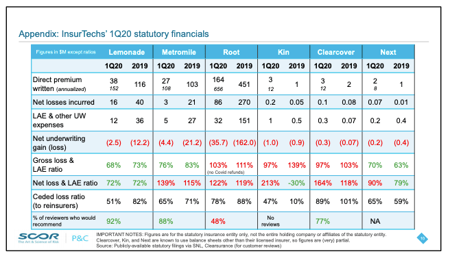 But in fairness to the company, things could be worse. Parsing some presentations on Lemonade and its cohort has made it plain that Lemonade is not the worst when it comes to insurance losses. Adrian Jones, deputy CEO of P&C Partners — a self-described “global technical and expertise center” that works with underwriters — posted the following chart to LinkedIn detailing loss ratios at various insurtech players in Q1 2020 (TechCrunch was also sent this deck, but wanted to make sure you could read it as well):