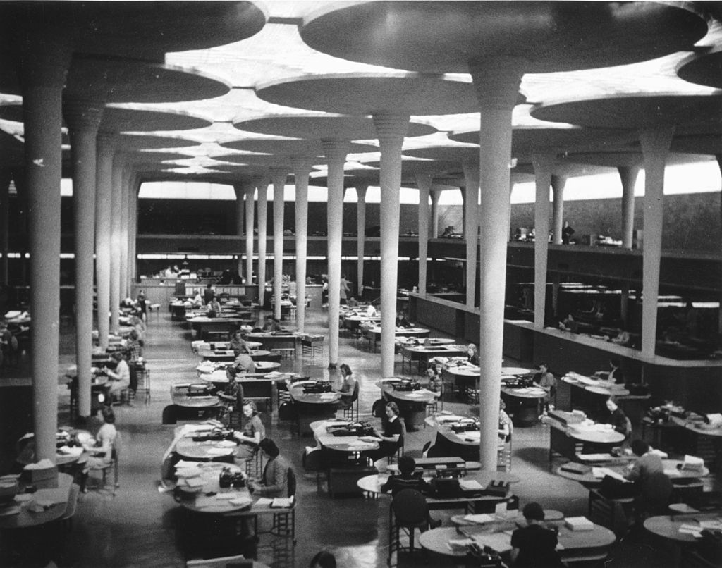 Unfortunately, I can only maintain the irony and half-earnest smile for so long while showing this image. The reality is that Wright’s building would never be built today: it’s arduously inefficient (from a headcount versus space ratio) and would be unlikely to survive a modern-day budget review (referred to in the industry as “value engineering”). A budget-conscious value engineering analysis would quickly replace Wright’s custom-built furniture with “equally functional” corporate furniture systems or a benching solution to maximize efficiency — oh, and, yes, collaboration.