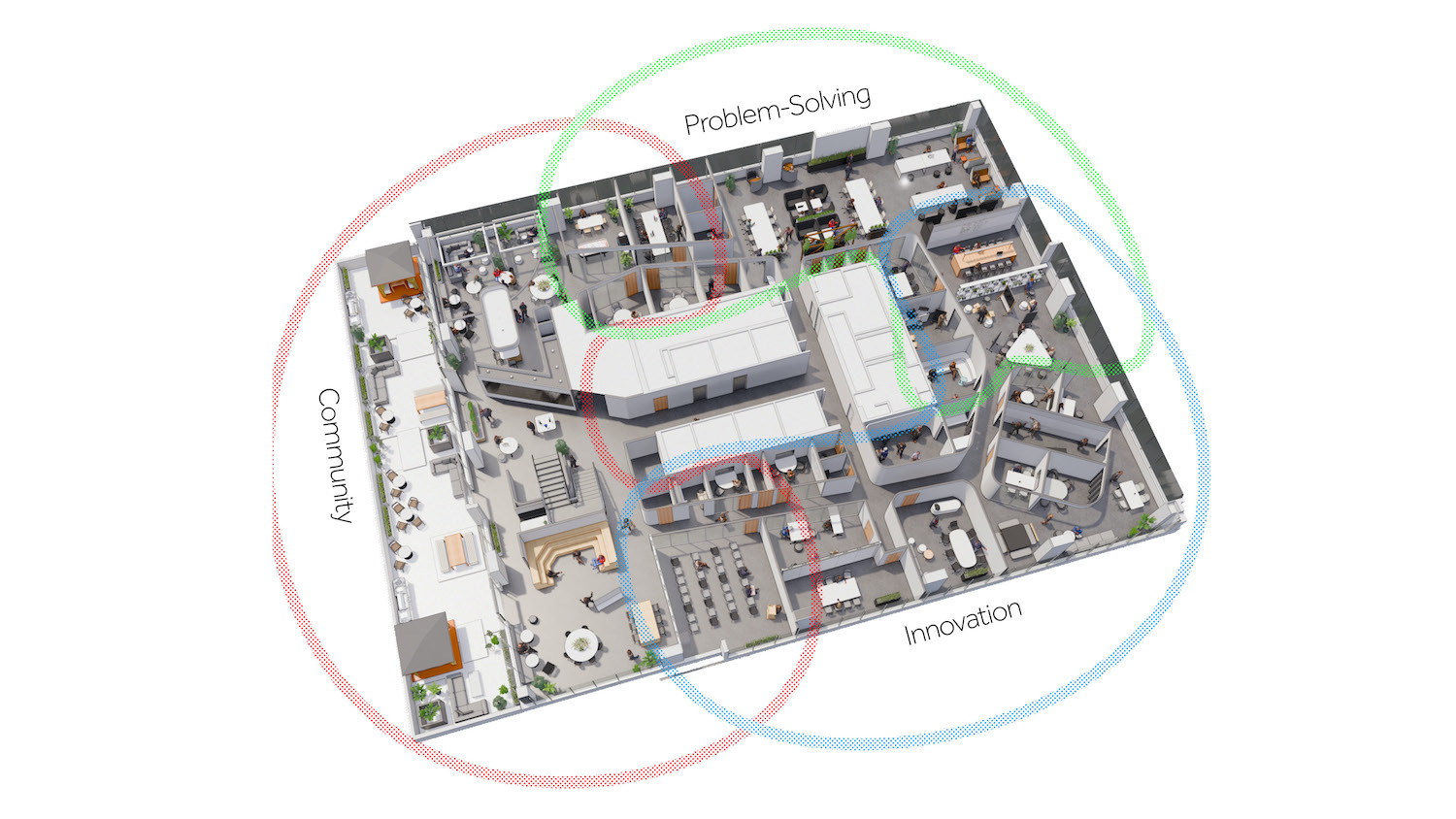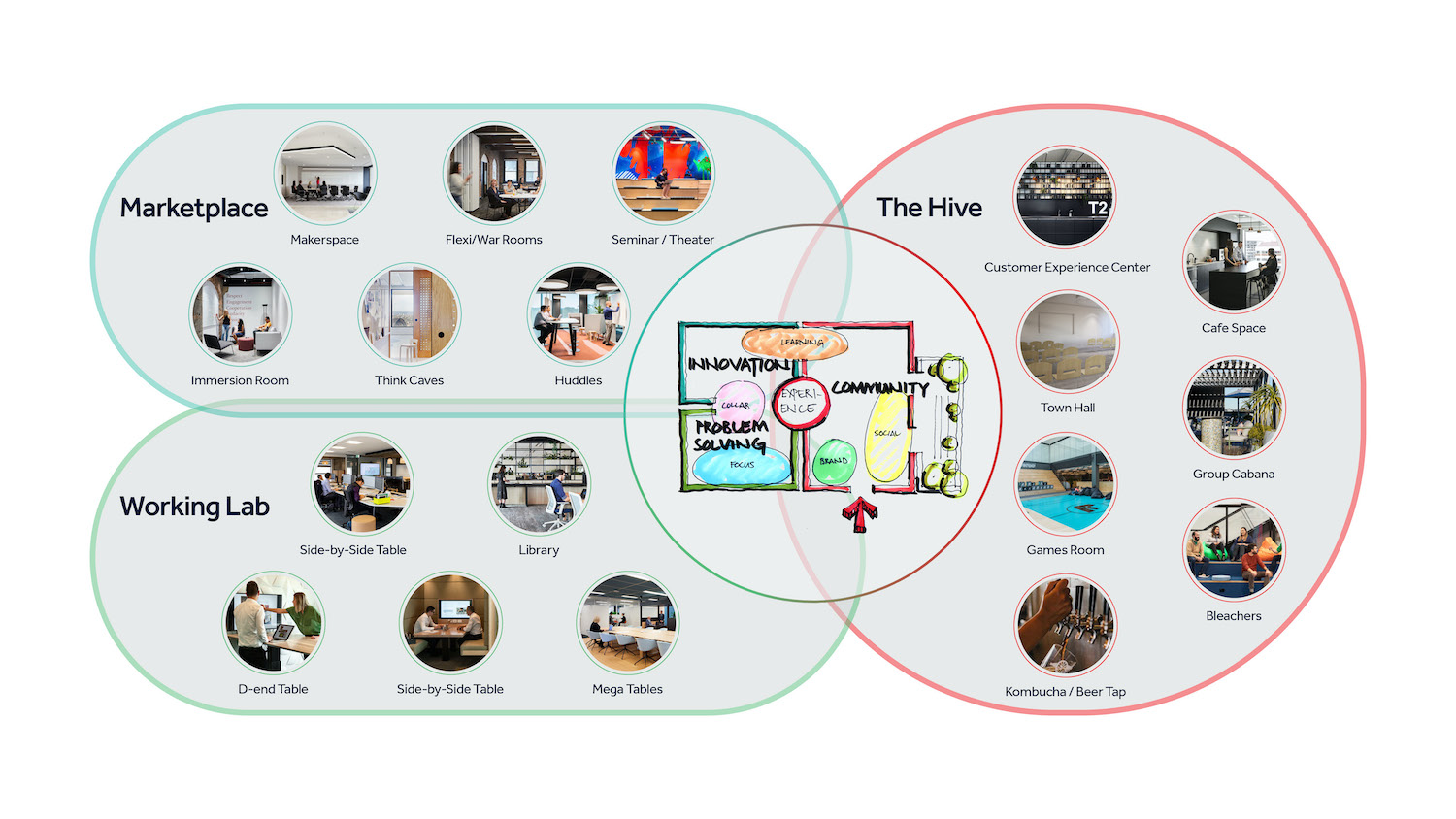 If you are wondering about how all this comes together, there is no right answer. Identifying the right typology depends on market sector and organizational needs. However, below is one example of how these zones and spaces integrate to become an interdependent ecosystem.