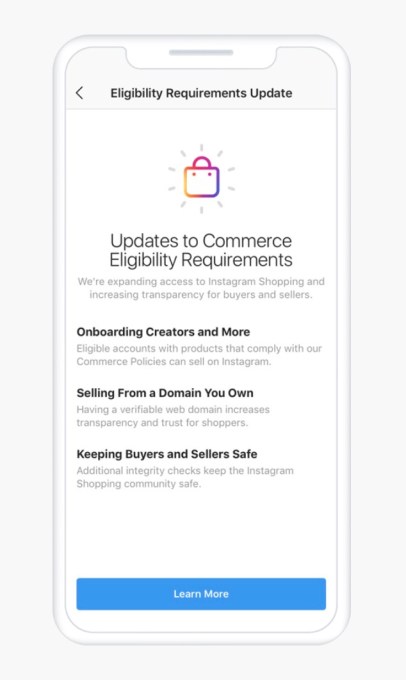Instagram announced today it’s expanding access to Instagram Shopping to more businesses, including creators who want to sell their own merchandise. To enable this expansion, the company introduced new “Commerce Eligibility Requirements” that offer a set of guidelines that interested businesses must adhere to, in order to qualify for Instagram selling.