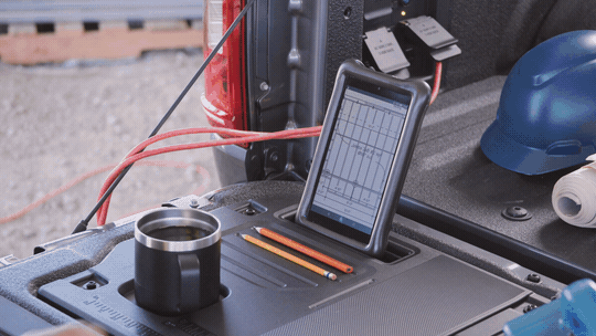 Out on the tailgate is another work surface that includes integrated rulers, a mobile device holder, a cup holder and a pencil holder.