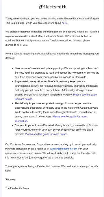 As it turned out, Apple had made it clear that it was discontinuing this feature in an email to Fleetsmith customers on the day of the transition. The email included links to several help articles that were supposed to assist admins with the transition. (The email is included in full at the end of this article.)