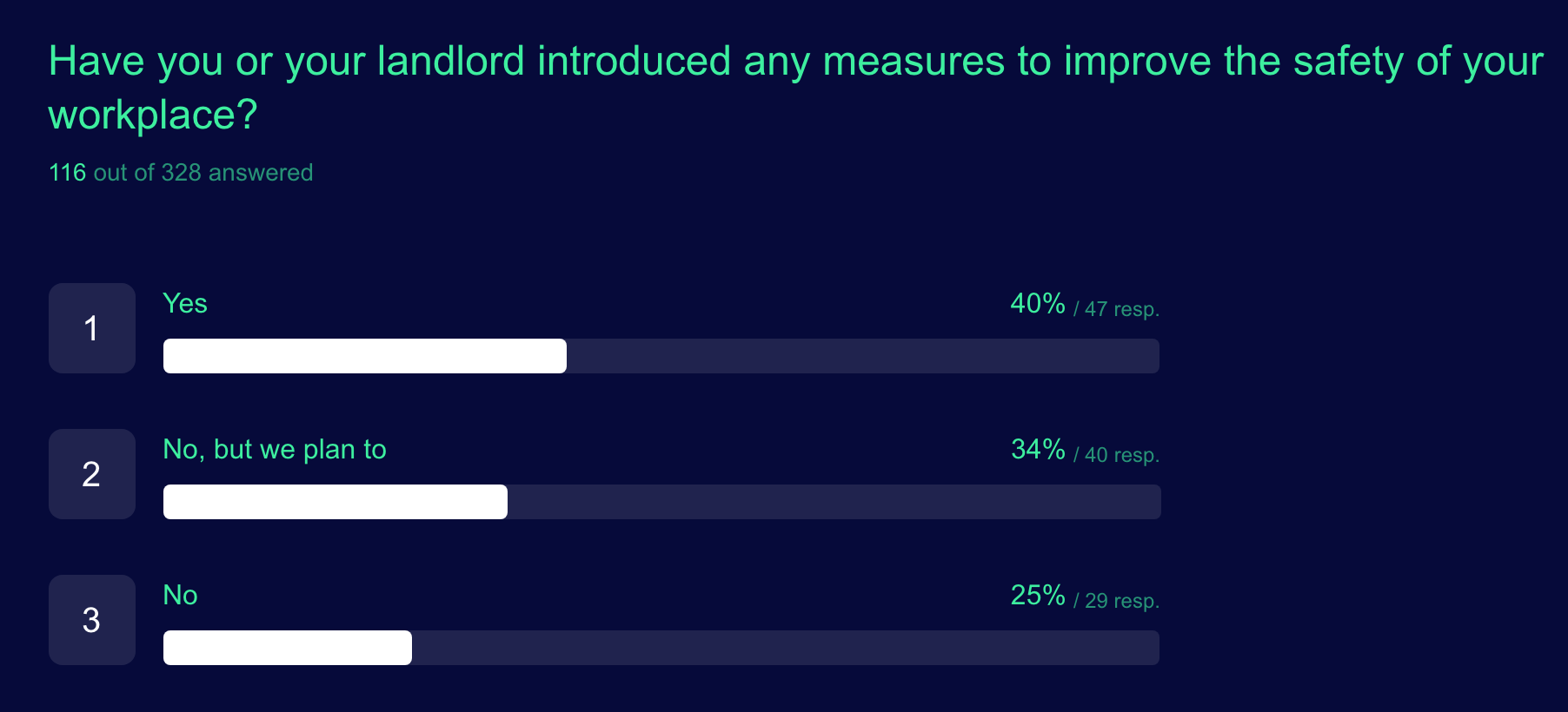 Offices appear to be responding well, with either 40% having already introduced measures to improve the safety of workplaces or 34% planning to, while 25% had not, probably because they do not have an office or use co-working spaces.