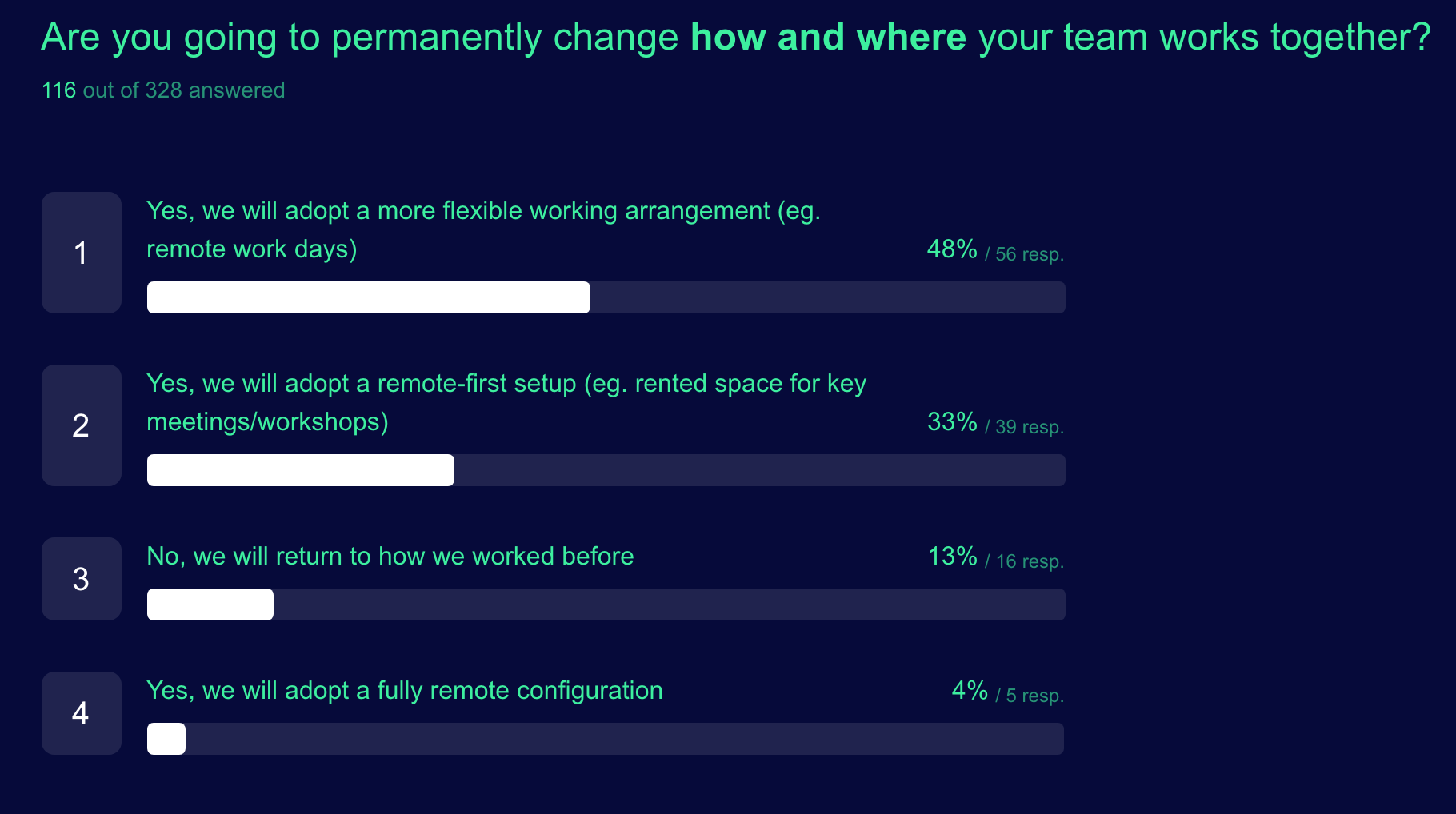 In answer to the question: “Are you going to permanently change how and where your team works together?”: 48% said they would adopt a more flexible working arrangement (e.g. remote work days); 33% will adopt a remote-first setup (e.g. rented space for key meetings/workshops); 13% plan a normal return to work; and just 4% will adopt a fully remote configuration.