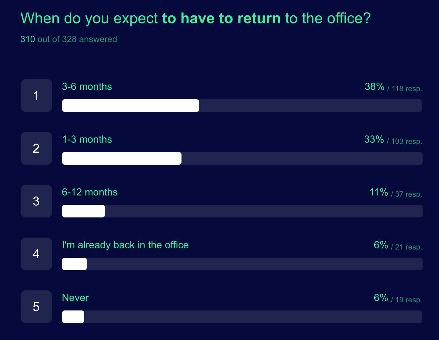 An exclusive survey compiled by Founders Forum, with TechCrunch, found 63% of those surveyed said they would only re-open in either 1-3 months or 3-6 months — even if the government advises that it is safe to do so before then. A minority have re-opened their offices, while 10% have closed their office permanently. The full survey results can be found here.