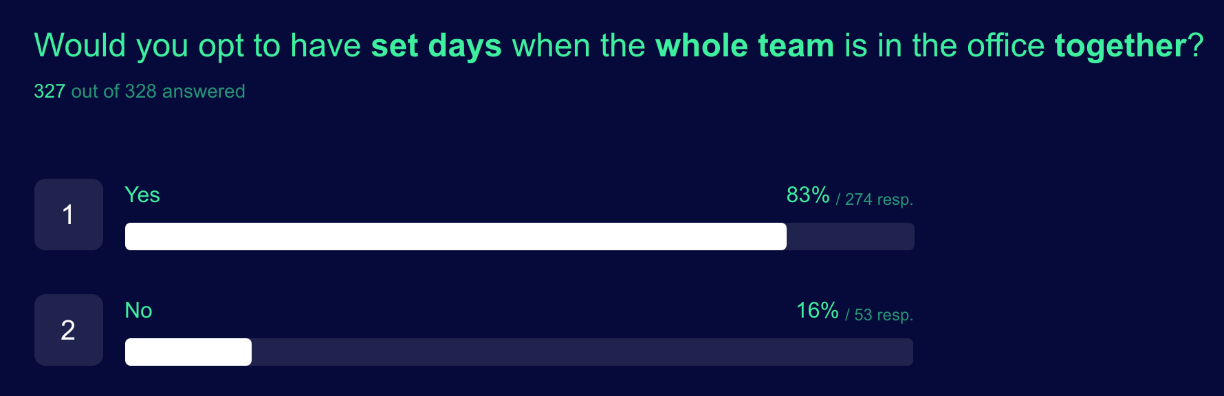 Given a full choice in the matter, 81% of those surveyed said they would prefer a hybrid of office and remote work, with only 11% wanting to go remote full time and 8% returning to an office full time. And 83% wanted to have set days when the whole team is in the office together.