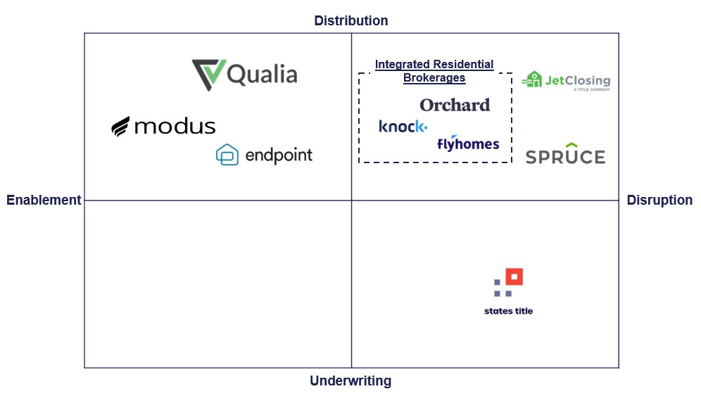 - Integrated residential brokerage platforms such as Flyhomes, Knock and Orchard that are building end-to-end platforms that span the homebuyer’s entire journey. These integrated platforms generate revenue by rolling secondary offerings such as title insurance into the sale process. Once deciding to expand into title, these brokerages can decide whether to leverage a “title agency in a box” offering such as Spruce or to build the capability in-house.