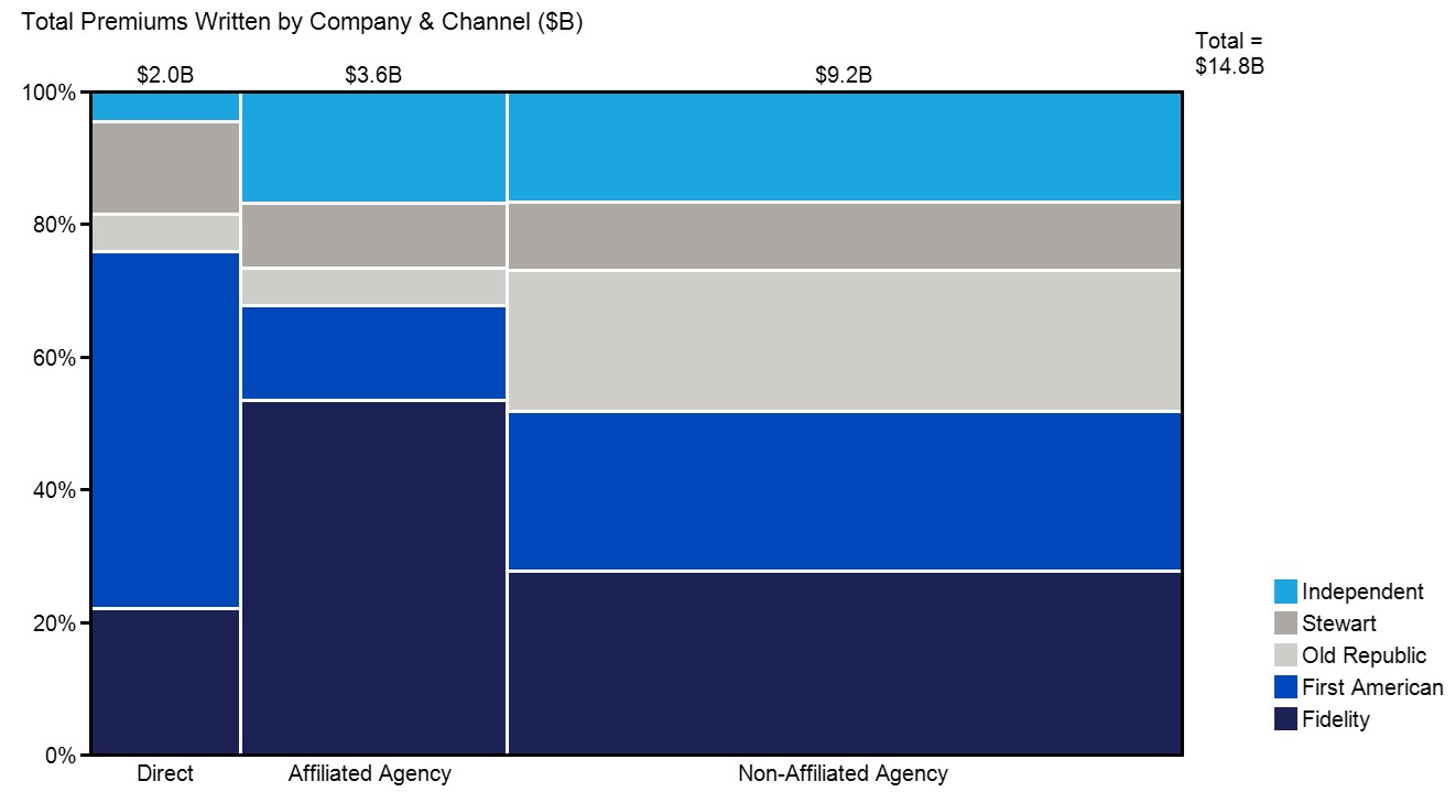 Several entities are involved in the insurance process, some of whom a buyer will interact with during the closing process. One is an insurance agent, to whom a realtor often refers a buyer after their offer was accepted. The agent does the hands-on work of assessing the risk of a policy by researching a title’s history. The other is an underwriter, or the insurance company, which assumes the risk of a claim. An insurance company may have some type of financial investment in the agent through a joint venture or affiliated business arrangement (an “Affiliated Agent”), may leverage an independent agency (a “Non-Affiliated Agent”), or may sell directly to the homeowner (“Direct”). In 2018, 62% of total written premiums went through non-affiliated agencies.
