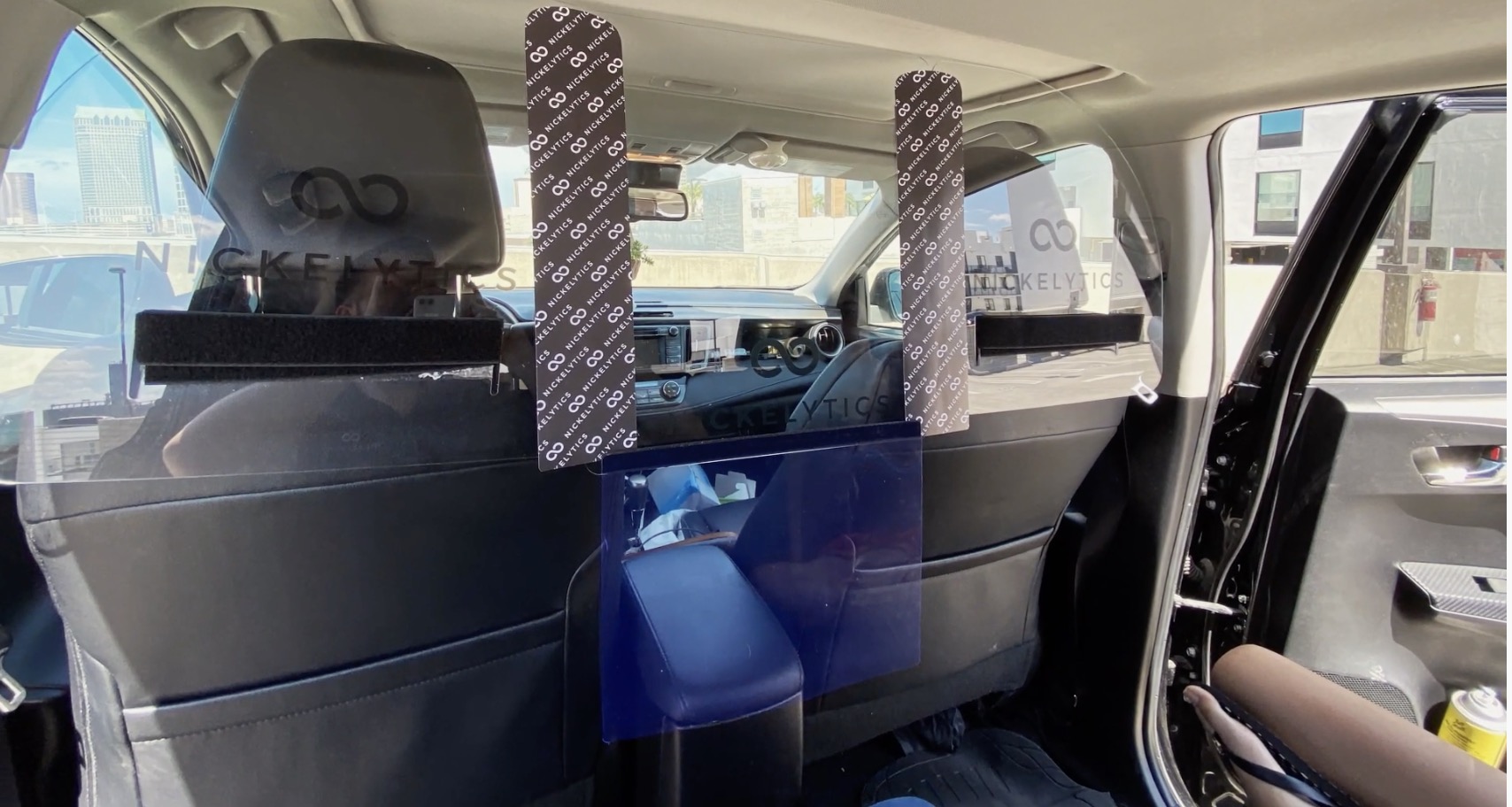 The Nickelytics ad shield is designed for ride-share, however. The plexiglass, which can be branded with a company logo or other marketing message, is flexible and can be quickly added or removed from a ride share vehicle.