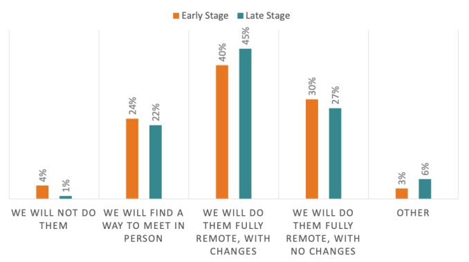 Most VCs have decided that remote deal-making is, at minimum, something that they need to become accustomed to. Only 4% of surveyed VCs said that they would not do remote deals, full-stop. Another 23% said that they were fine with remote deals, albeit with some ability to meet entrepreneurs in person.