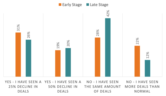 Most notable in the above chart is that early-stage VCs are both the most likely to report that they have seen a decline in deals (50%) and that they have seen more deals (22%). Perhaps early-stage investing is super uneven, while the 42% of late-stage investors reporting flat deal volume implies the opposite with investing in later-stage startups?