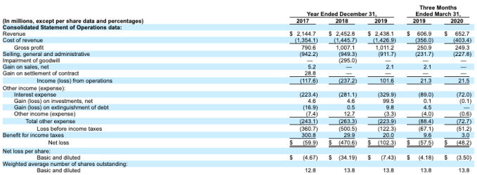 Looking at the far-right column, we can see a company with material revenues, though slim gross margins for a putatively tech company. It generated $21.5 million in Q1 2020 operating profit from its $652.7 million in revenue from the quarter. However, interest expenses of $72 million in the quarter helped lead Rackspace to a deep $48.2 million net loss.