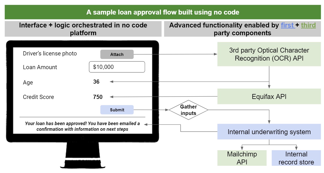 Second, architecturally, the ubiquity of cloud and APIs enable “modular” software that can be created, connected and deployed quickly at little cost composed of building blocks for specific functions (such as Stripe for payments or Plaid for data connectivity). Both third-party API services and legacy systems leveraging API gateways are dramatically simplifying connectivity. As a result, it’s easier than ever to build complex applications using pre-assembled building blocks. For example, a simple loan approval process could be built in minutes using third-party optical character recognition (a technology to convert images into structured data), connecting to credit bureaus and integrating with internal services all via APIs. This modularity of best-of-breed tools is a game changer for software productivity and a key enabler for no code.