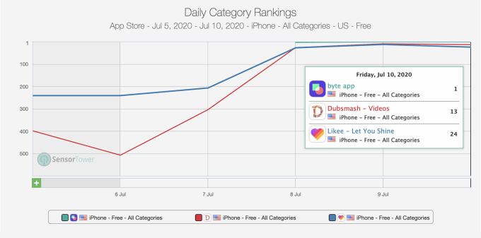 Byte, for example, jumped from No. 210 in Social Networking in the U.S. App Store on July 5 to No. 1 in Social and No. 1 Overall as of today, thanks to an exodus of primarily Gen Z TikTok users. Dubsmash got as high as No. 10 Overall and Likee got as high as No. 17 during the week, also on iOS. (They’ve fallen a bit since.)