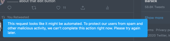 Twitter users reported seeing error messages on the platform as the situation went on. TechCrunch reporter Natasha Mascarenhas saw this error (see below) when she tried to create a threaded tweet. TechCrunch reporter Sarah Perez saw a similar error when trying to post a normal tweet. Both have verified accounts.