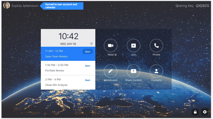 You can link it to your calendar so that all your meetings appear in a sidebar, and you just touch the next meeting to connect. If you need to share your screen it includes ultrasonic pairing between the appliance and your laptop or mobile phone. This works like Bluetooth, but instead of sending out a radio signal, it sends out a sound between 18 and 22 kHz, which most people can’t hear, to connect the two devices, Smith said.