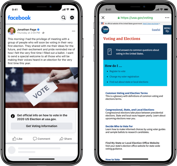 Starting today, Facebook posts by federal elected officials and candidates — including presidential candidates — will be accompanied by an info label prompting anyone who sees the post to click through for official information on how to vote. The label will link out to usa.gov/voting. For posts that address vote-by-mail specifically, the link will point to a section of the same website with state-by-state instructions about how to register to vote through the mail.