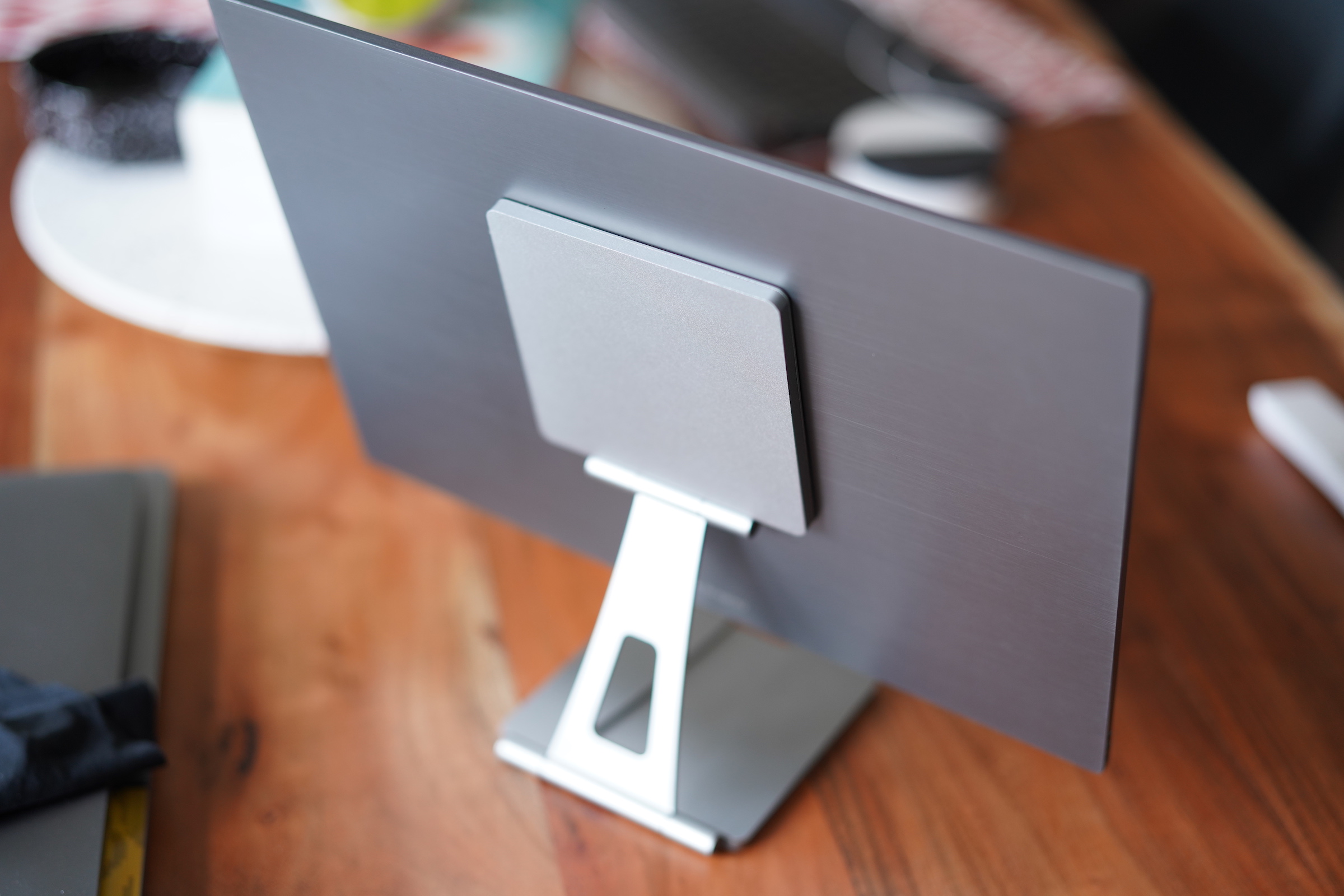 The display is made of glass and aluminum, and feels very high quality to match your MacBook. There are two USB-C ports and a mini HDMI port on the side, and a 2.5mm mini stereo jack for audio out. One of the USB-C ports is dedicated to power only, and the other is for connecting a display, with power delivery supported as well for a single-cable connection to modern Macs.