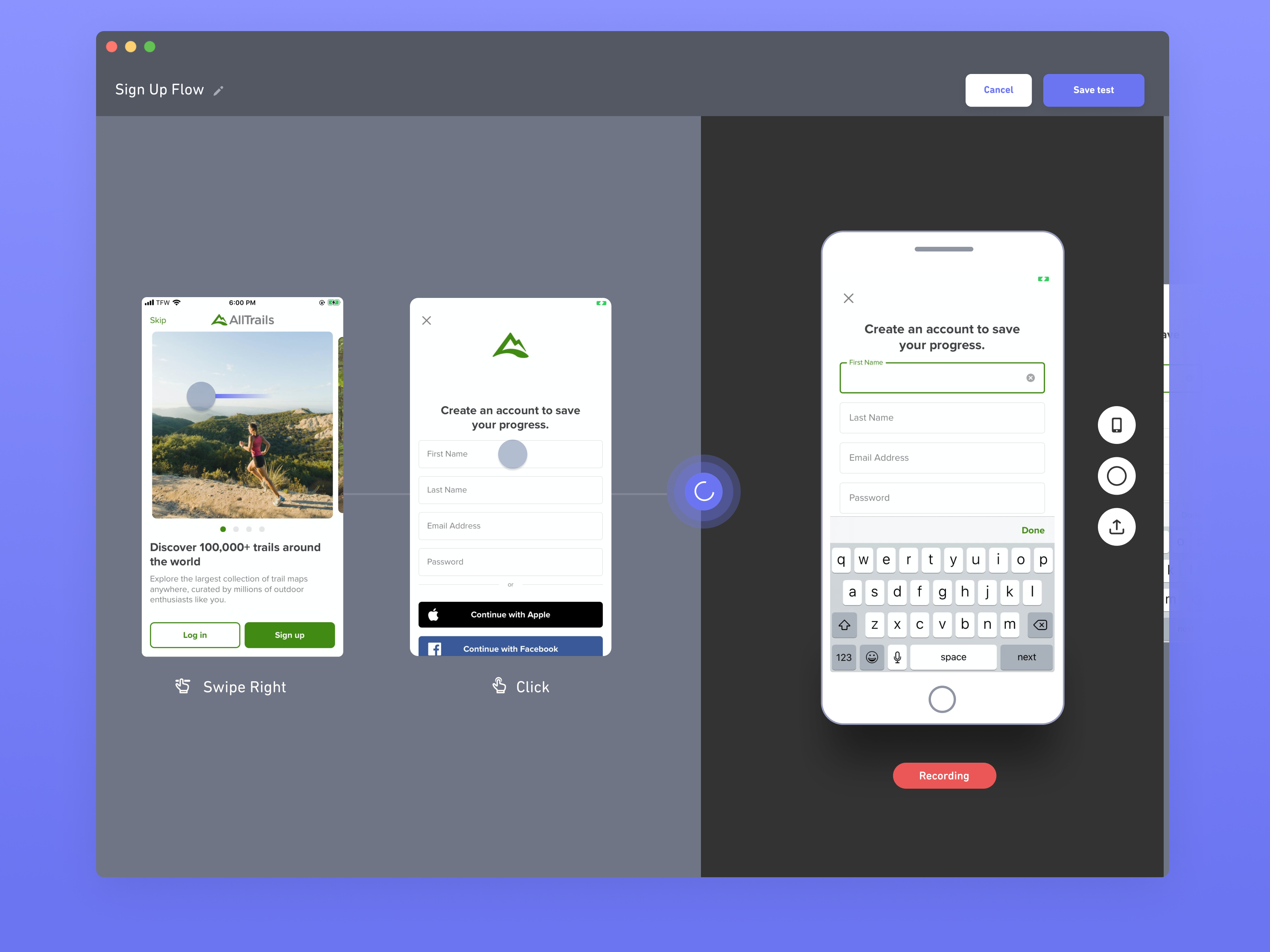 After uploading your app, you see your app running in your browser window. Waldo records every screen and every action you take. For instance, you can record the signup flow or a feature that lets you upload content.